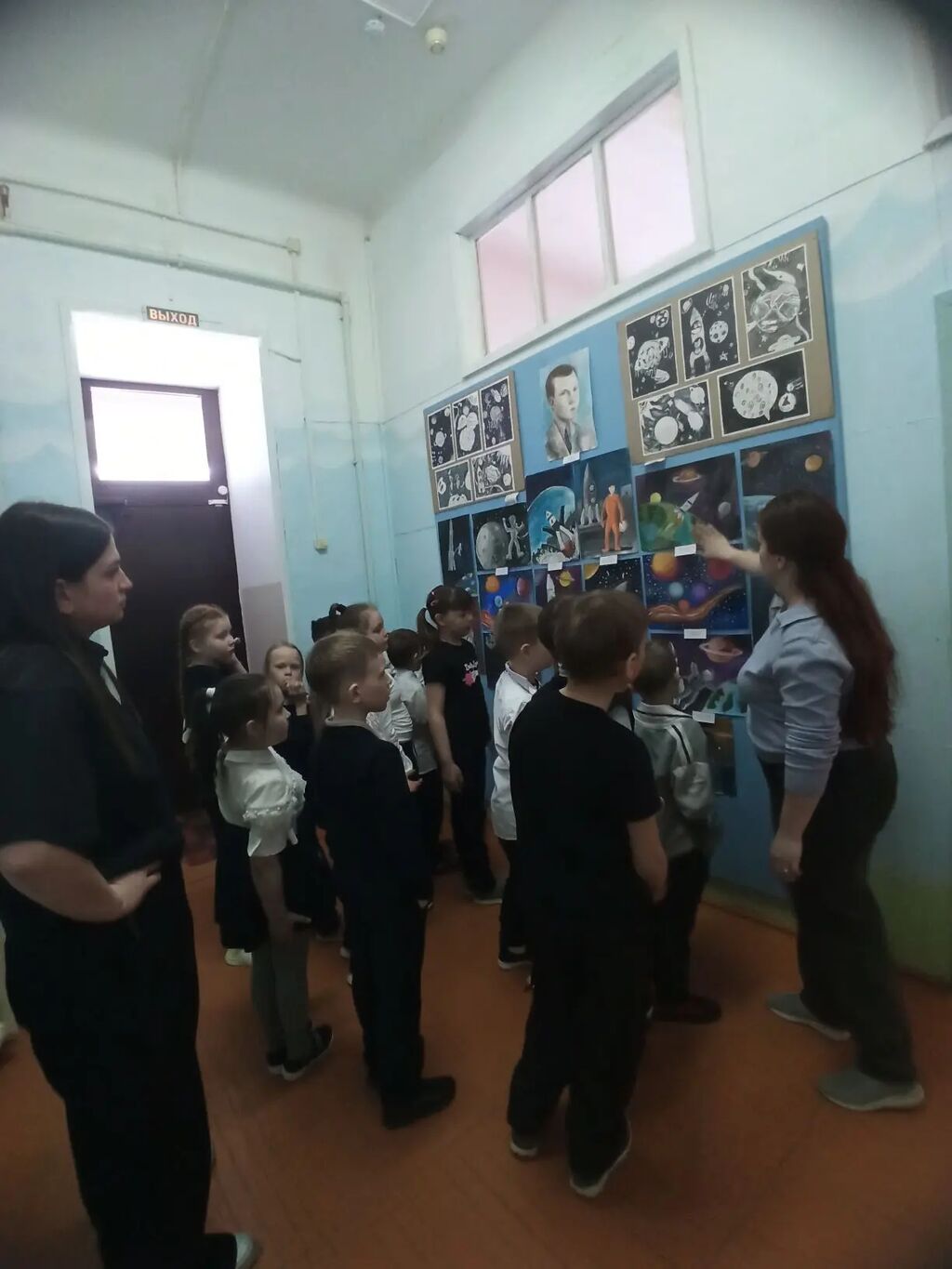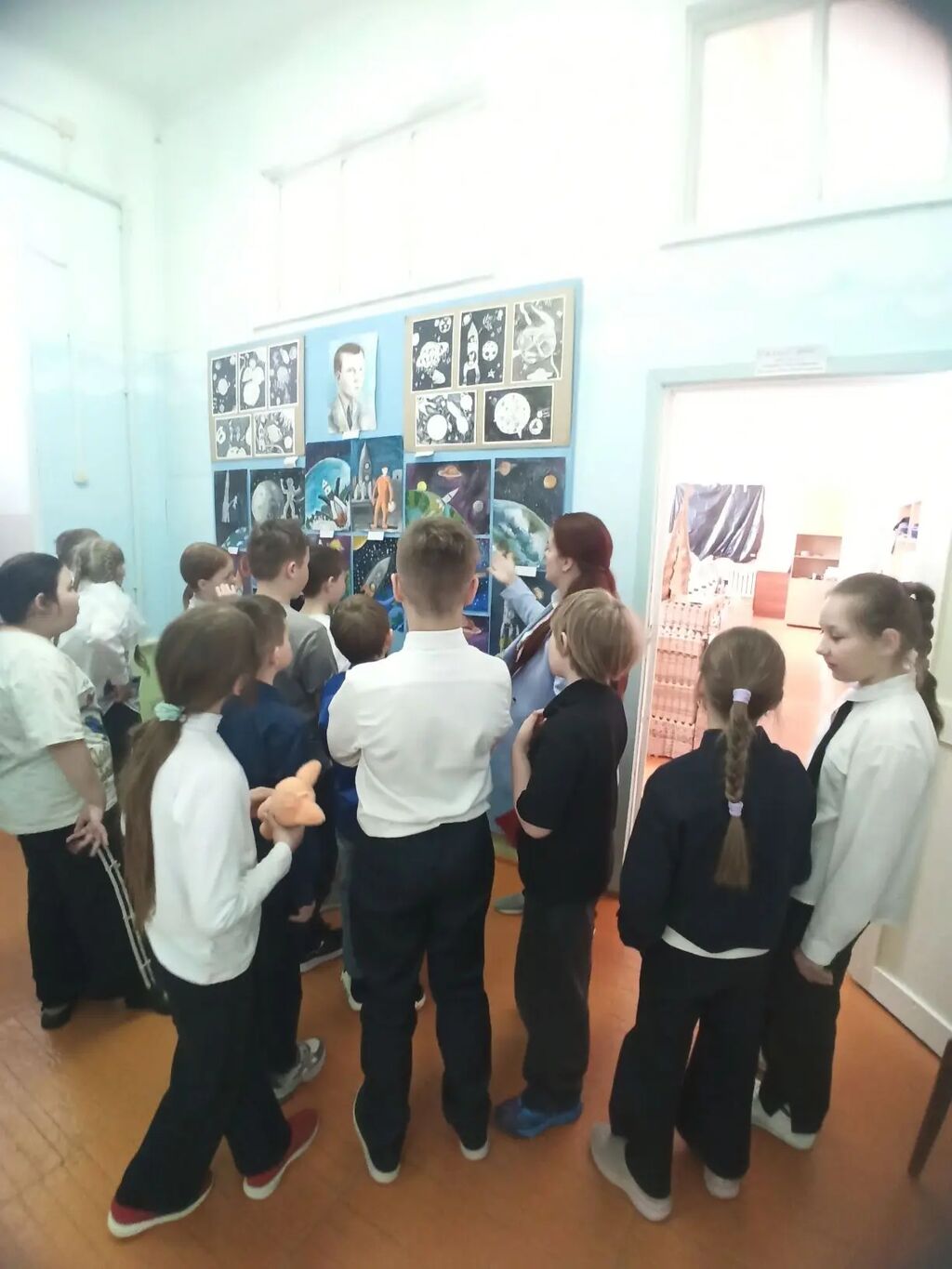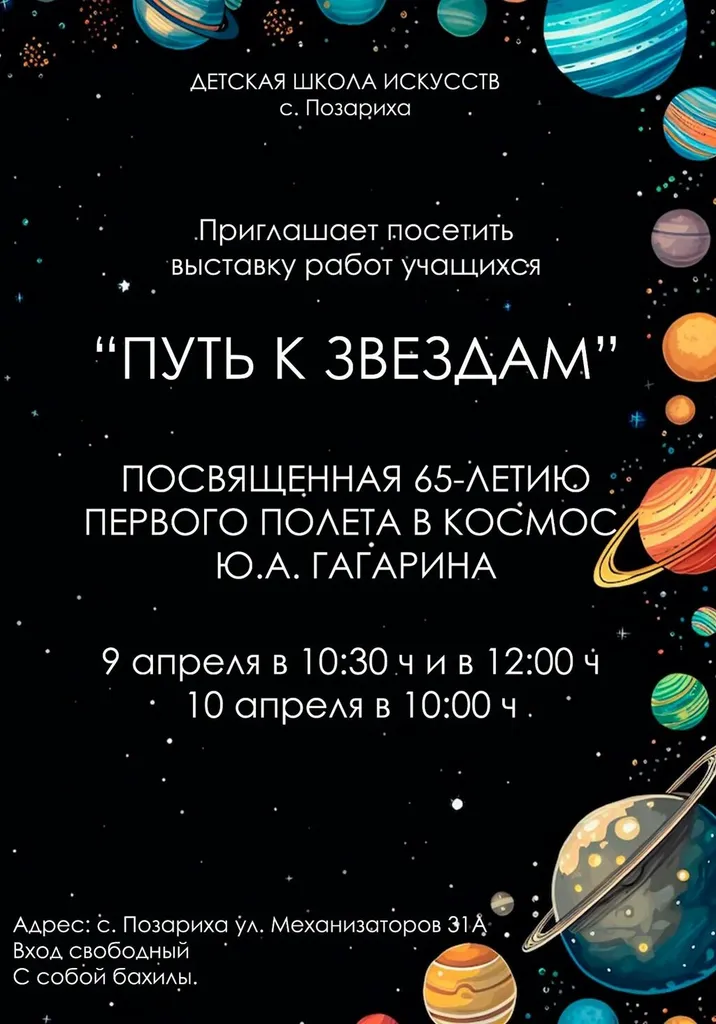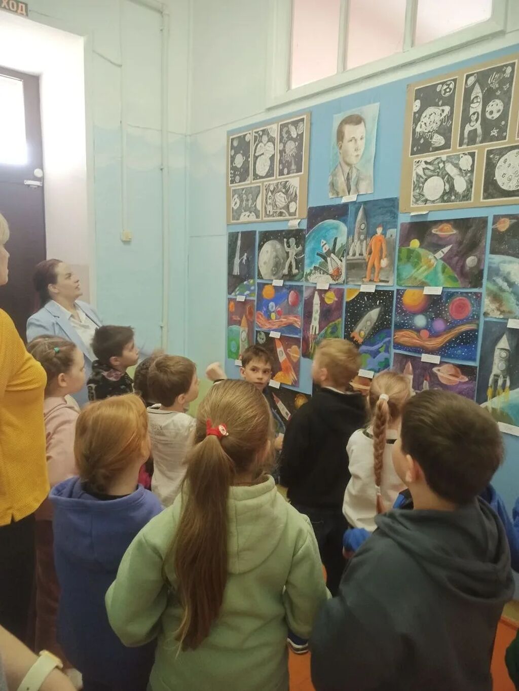 На выставке представлены работы, выполненные в технике графика маркером и живопись гуашью. Работы отображают сверкающие звезды и загадочные планеты, стремительные ракеты, уносящиеся в космическое пространство, портрет Юрия Алексеевича Гагарина.
